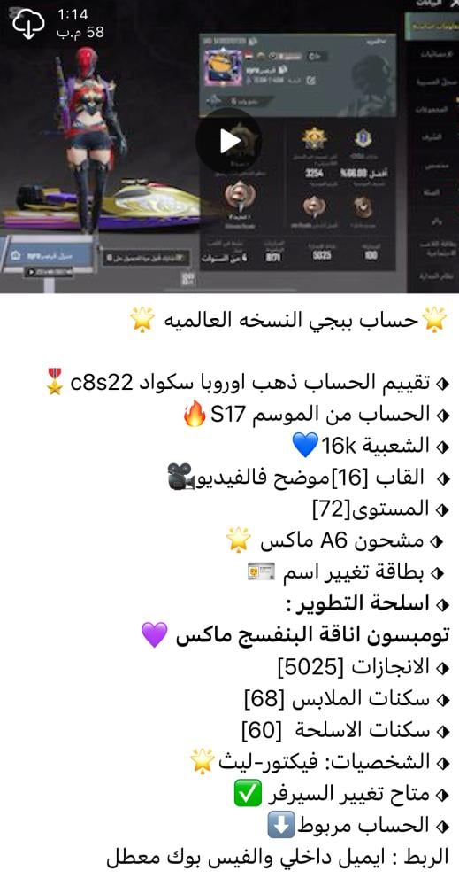 ❤️ اضغط هنا وانضم لقناتنا على تطبيق التلجرام ❤️ لمشاهدة الحسابات بالفيديو وكل ماهو جديد