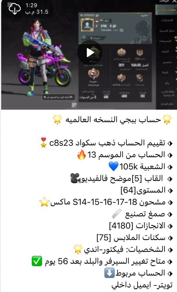 ❤️ اضغط هنا وانضم لقناتنا على تطبيق التلجرام ❤️ لمشاهدة الحسابات بالفيديو وكل ماهو جديد